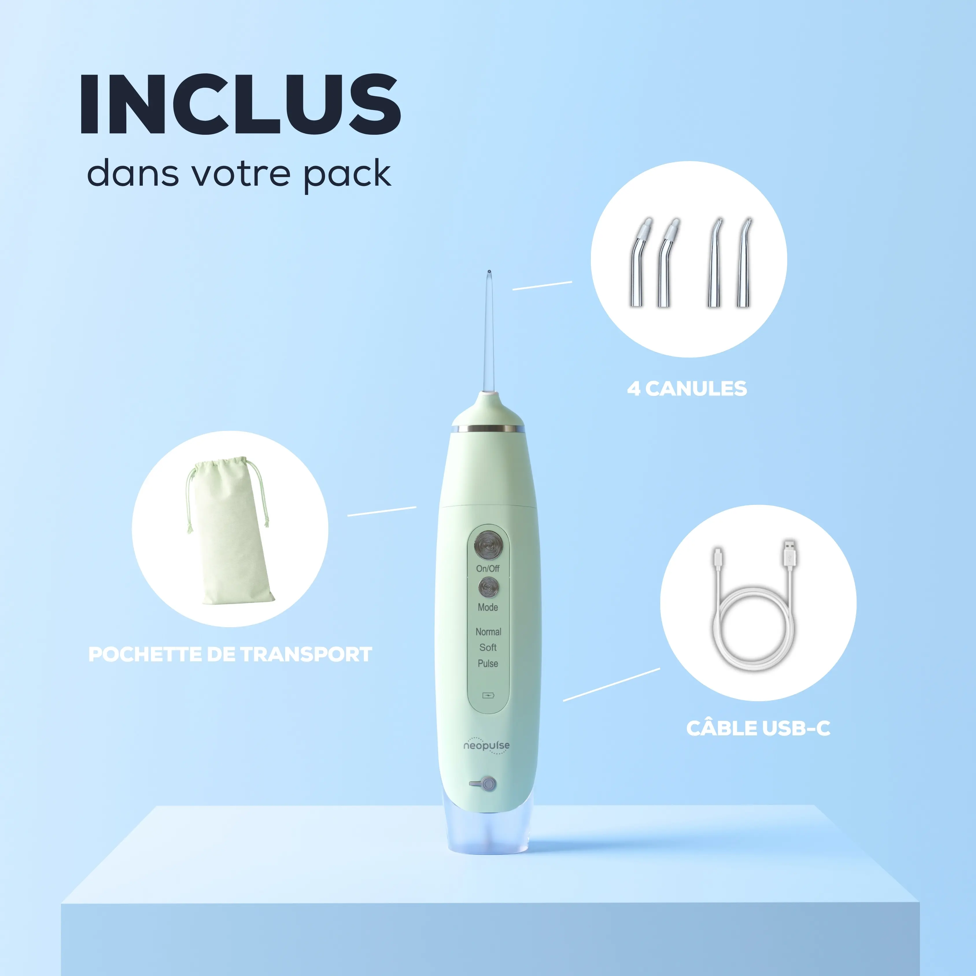 Le jet dentaire NEOPULSE MY FIRST est fourni avec 2 canules classiques pour le nettoyage interdentaire et 2 canules orthodontiques pour laver en profondeur les brackets des appareils orthodontiques. Les embouts orthodontiques peuvent être également utilisés au quotidien pour frotter entre les dents.